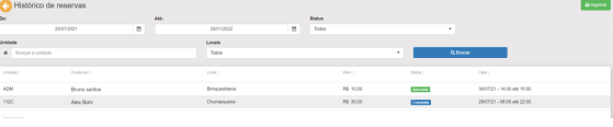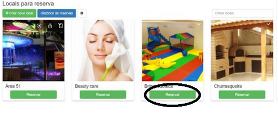 Aqui ficará a parte de reserva dos locais de lazer, apenas selecionado a área desejada e clicando na “reservar” em tom de verde.