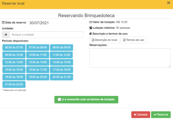 Terminando de escolher o dia, aparecera uma janela onde pedira os horários que irá reservar e o motivo em observações.