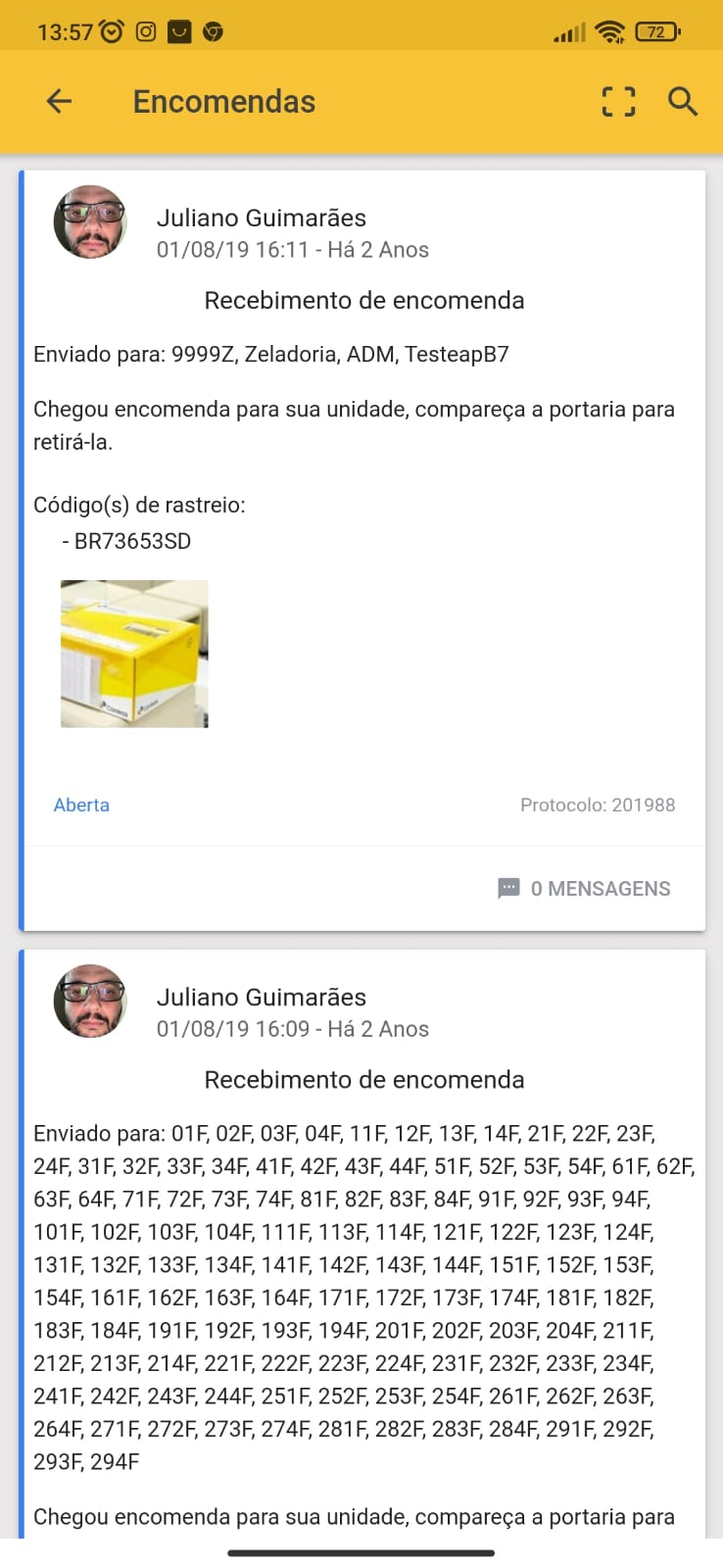 Aqui fica a parte de encomendas, onde são compartilhadas as informações como para qual morador e apartamento vai, assim fica de fácil acesso para todos visualizarem e retirar.