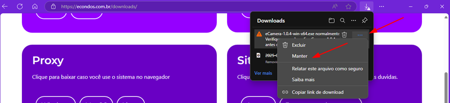 Após baixar, caso apareça um alerta de segurança no navegador, siga os seguintes passos: