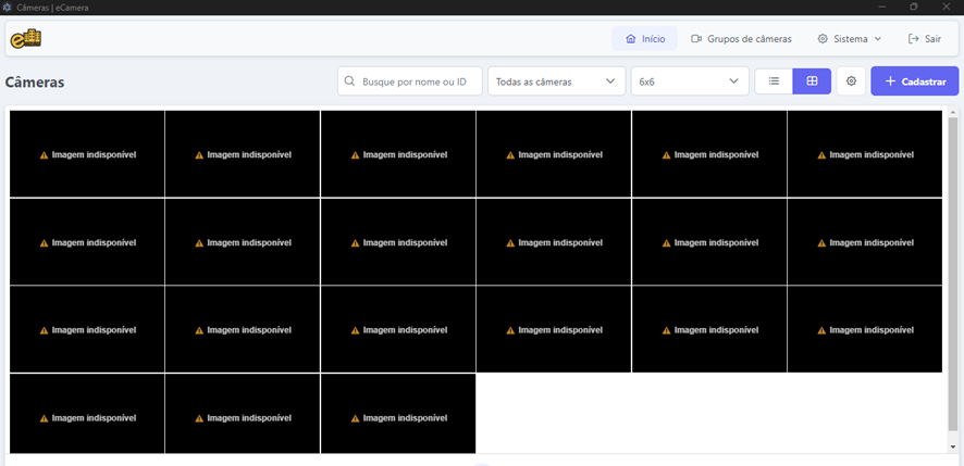 Ao acessar, é possível visualizar e gerenciar as câmeras em todos os condomínios onde o usuário conectado está inserido. A visualização está disponível em modo lista e em grade, com capacidade de 6x6 câmeras.